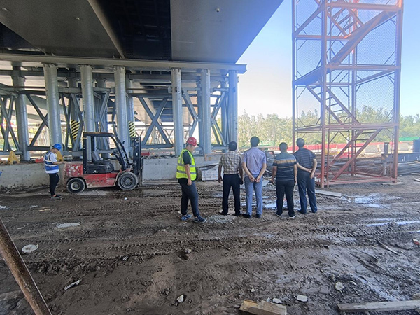 检查组一行首先深入104跨线桥施工现场,分别对钢混叠合梁AB段右幅顶板钢筋绑扎情况及桥梁墩柱外观质量进行一一检查,检查组提出,绑扎钢筋时要注意施工安全,正确佩戴防护,同时要注重施工细节处理,对桥梁抹面进行精细打磨,保证其平整度满足验收要求。