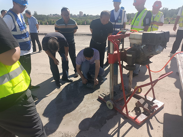 随后行至跨线桥与高速匝道连接路,为检测出水稳层的厚度、抗压强度、完整性、密实性等数据指标,现场采用钻芯机钻取了芯样,通过查看芯样结构是否完整,检测芯样厚度是否达标,并记录数据,判断是否达到设计要求。经实测,厚度和压实度基本符合设计要求。