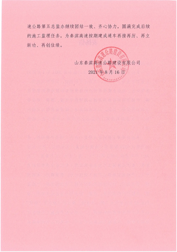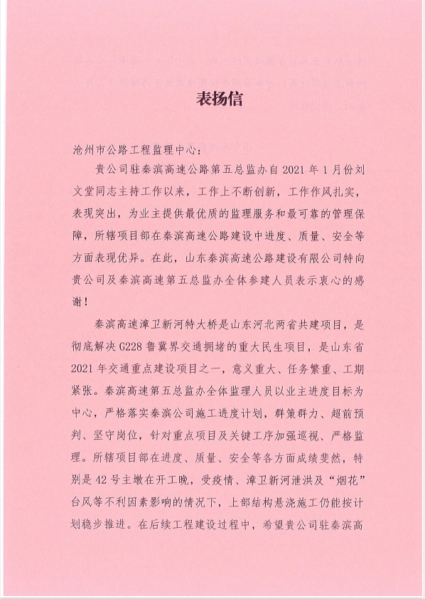 监理中心稳步推进秦滨高速漳卫新河建设项目,获秦滨高速建设有限拼搏网上登陆感谢表扬