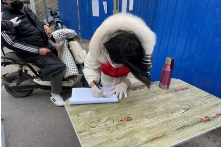 照片中正在为居民进行登记的志愿者是沧州开发区站职工裴云。9日被封控在市区后,一想到奋战在一线的医护人员和被困在各个岗位的人们有家难回,她心中十分焦灼惦念,强烈的责任感驱使她第一时间报名了新华区小树林社区的志愿服务岗位。尽管被冻得瑟瑟发抖,但是寒风中的她仍然尽职尽责、一丝不苟,为进出路口的每一个人员进行体温测量和登记。