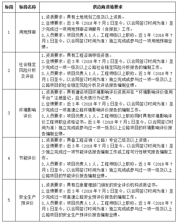 (三)标段划分:5个标段,1标段用地预审、2标段社会稳定风险分析及评估、3标段环境影响评价报告、4标段节能评价、5标段安全生产预评价。