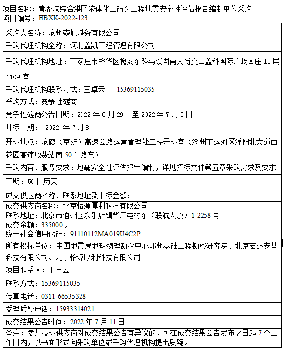 黄骅港综合港区液体化工码头工程地震安全性评估报告编制单位采购成交结果公告