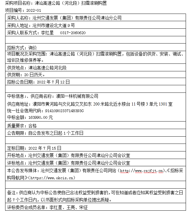 津汕高速公路(河北段)扫雪滚刷购置中标公告