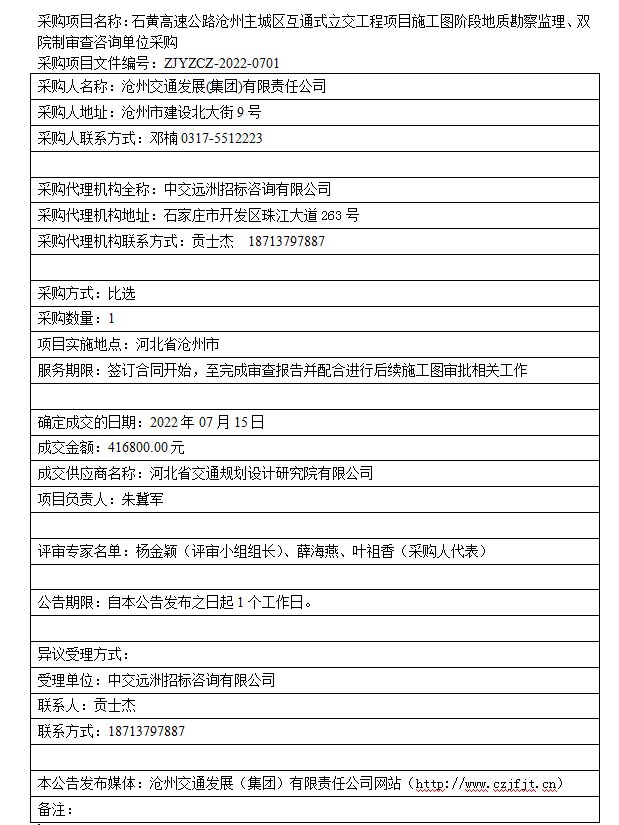 石黄高速公路沧州主城区互通式立交工程项目施工图阶段地质勘察监理、双院制审查咨询单位采购成交结果公告