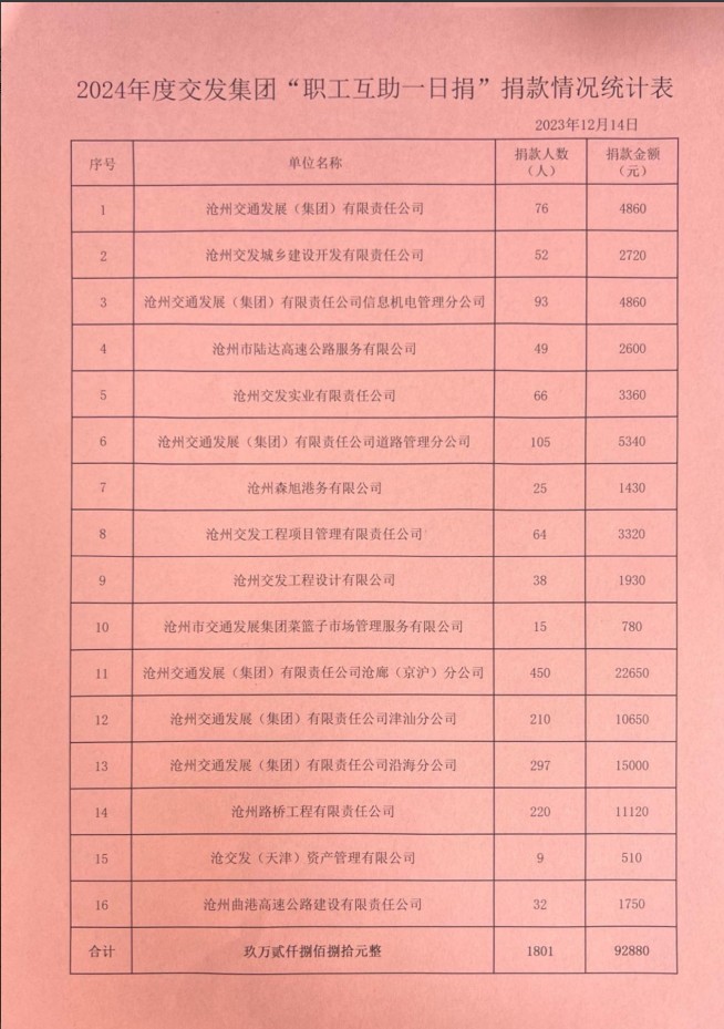 本次活动共有1801名职工参与捐款,捐款金额共计92880元,募集善款已全部上缴沧州市职工服务中心。