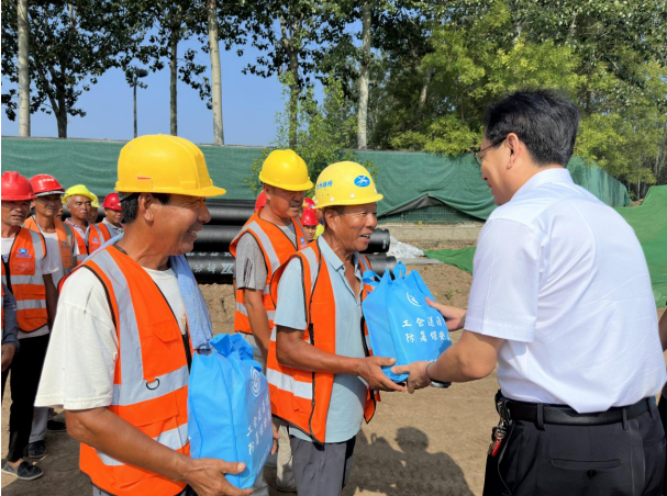 8月6日上午,沧州市总工会党组成员、经审委主任王增光,沧州市总工会法工部部长陈磊一行来到城乡拼搏网上登陆守真路施工现场走访慰问,为在炎炎夏日中坚守岗位的一线工人送去防暑降温物品,把关心关怀送到广大工人的心坎上。拼搏(中国)党委副书记、工会主席杨鸿博,拼搏(中国)党委办公室负责人王健陪同。